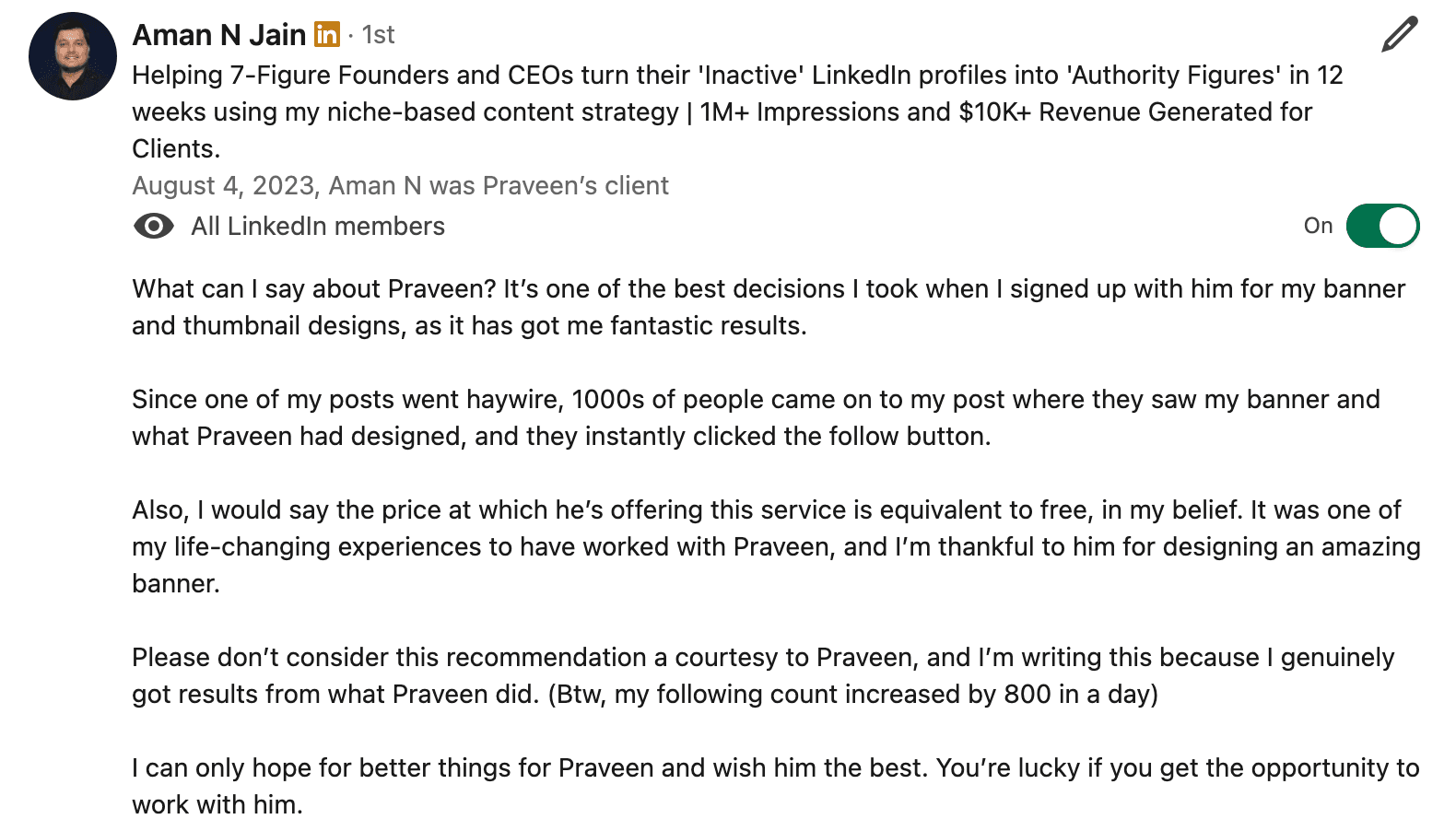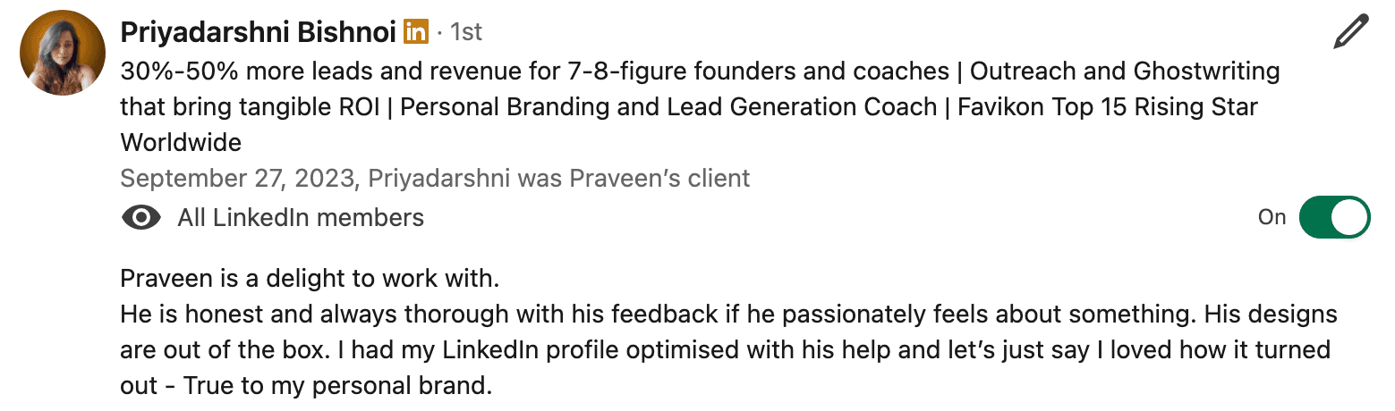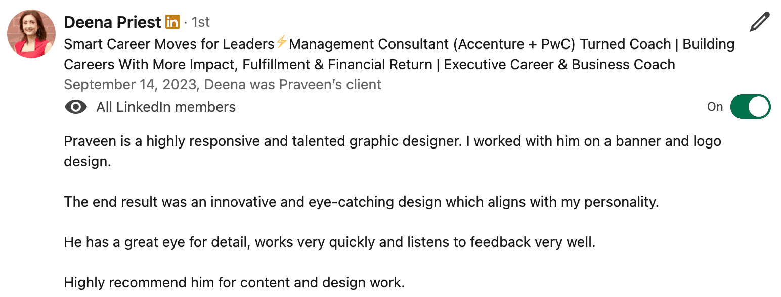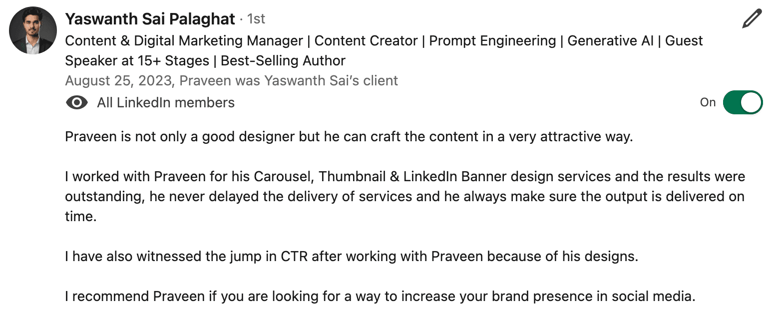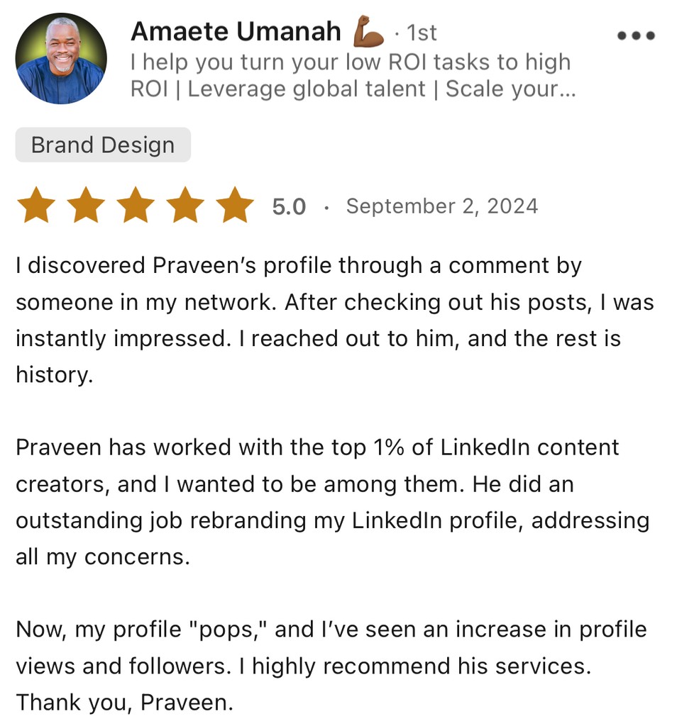 "Praveen’s designs have elevated my Instagram game, giving me a strong presence without the time commitment. His quality is top-notch”
